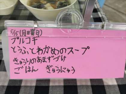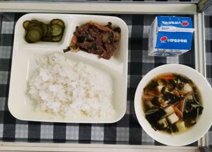 今日の給食は、プルコギ、スープ、きゅうりの甘酢漬けがでました。