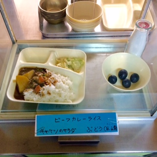 本日の献立は、ビーフカレーライス、キャベツのサラダ、ブドウ(巨峰)、牛乳です。