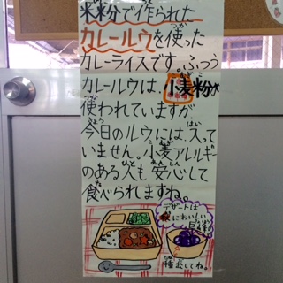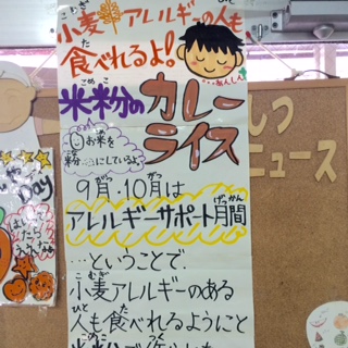 今日は子どもたちの大好きなカレーライスの登場です。9月10月は「アレルギーサポート月間」今日のカレーのルウは小麦粉アレルギーの児童も食べられる米粉で作ったカレーライスです。