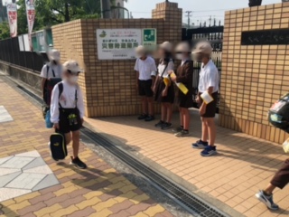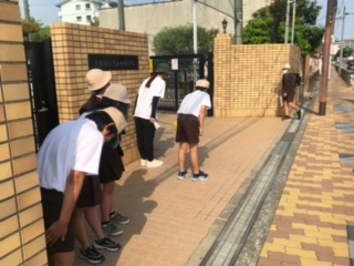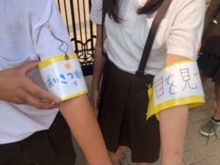 代表委員会の子どもたちが腕章をつけてあいさつをしています。