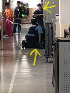 まず、教職員が不審者が児童へと向かわないように制止する訓練をして、その後、駆けつけた警察官が不審者を確保するように進めました。黄色い矢印が警察官です。