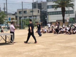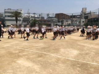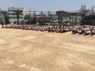 防犯訓練の最後にクラスごとに運動場に集合しました。