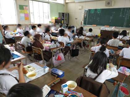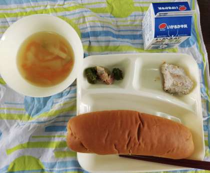 今日の給食には、かつおのマリネ焼きがでました。(皿の小分け区分の右側)