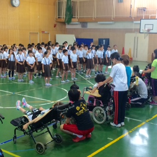 交流会が始まりました。両校の児童がハイタッチして交流会の開始です。