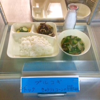 今日の献立は、プルコギ、トック、きゅうりとコーンの甘酢和え、ご飯、牛乳です。