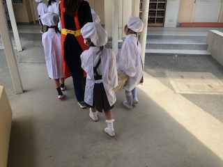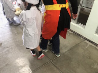 1年生にとっては食器などはとても重いですね。また、おかずの食缶を運ぶのも危ないので担任がいっしょに運んでいます。