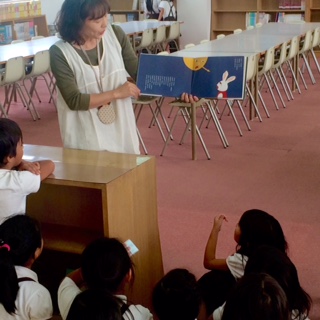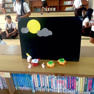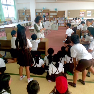 今日は朝から、雨が降ったり止んだりのお天気です。運動場も赤旗が立って使用出来ません。子どもたちが、身を持て余している時に、図書ボランティアてんとう虫さんの放送が流れて来ました。“ピン・ポン・パン・ポーン”「今日は10時40分頃から、月のお話しの読み聞かせをします。図書室に来てください」