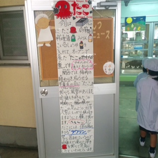 給食の時間が来ました。今日のメインはタコです。タウリンがたっぷり疲れが取れるそうです。
