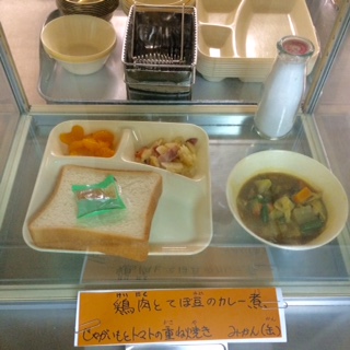 今日の献立、鶏肉とてぼ豆のカレー煮(米粉のルー)、ジャガイモとトマトの重ね焼き、みかん(缶)、食パン、牛乳です。