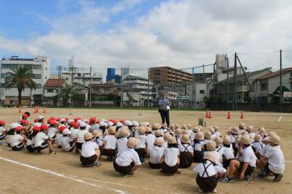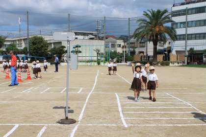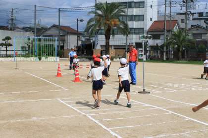 道路の横断の仕方、道を歩くときの場所、信号機の色の意味について詳しく教えていただきました。その後、運動場に用意した道路を歩きながら、一つひとつ確認しながら学習しました。
