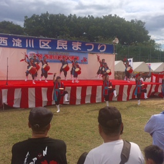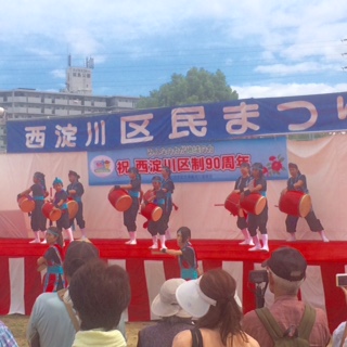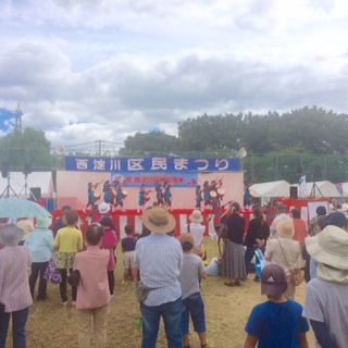 西淀川区民まつりが賑々しく開催されています。大和田小学校生涯学習ルーム創作エイサーの皆さんがステージに登場です。