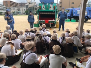 環境局の方に来ていただき、パッカー車体験をしました。パッカー車へのゴミの入れ方、出し方などを実演されています。