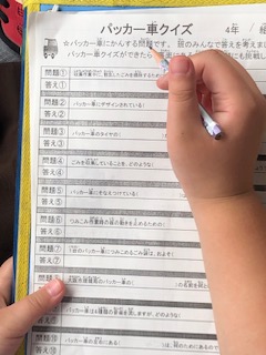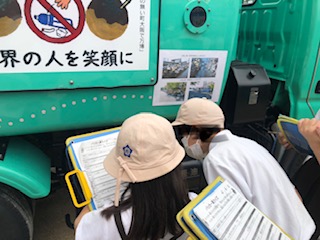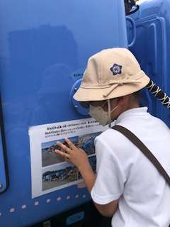 クイズ形式でパッカー車について見ています。中を見る穴もありました。(写真下)