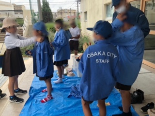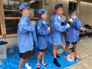 作業服を着てポーズを決めています。作業服は見学の子ども用に作られた物です。