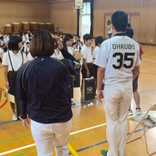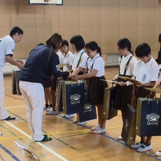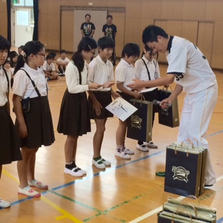 最後に、球団からT岡田選手をはじめ、現役選手のサイン色紙や、児童一人一人にリックサックなどのプレゼントをいただきました。