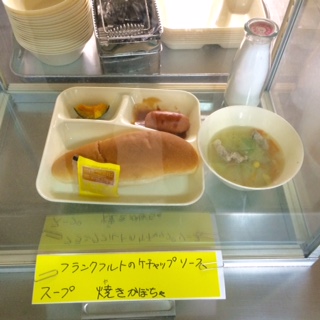 今日の献立、フランクフルトのケチャップソース、スープ、焼きカボチャ、大型コッペパン、牛乳です。