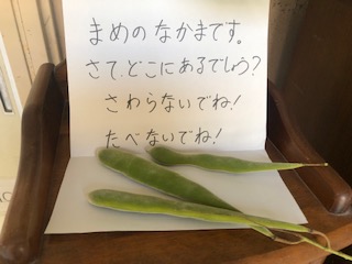 また、大きな豆(写真下)を見せて、学校にあるので探してみましょう、と話しました。