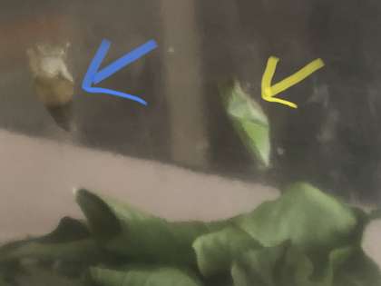 黄色はこれから成虫(チョウ)になるさなぎ、青色はすでにチョウになったものです。