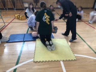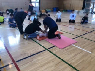 講習用の人形とAEDを使って、一人一人が救命法を学んでいきます。
