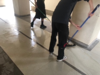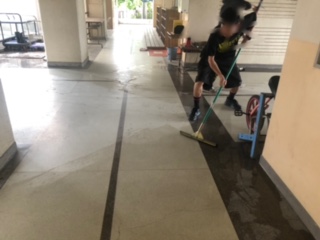 廊下には雨が降り込んで水がたまっていました。教職員が水をかき出して、滑らないようにしています。