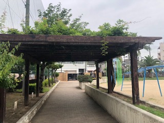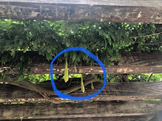答えはプロムナードにある藤(ふじ)です。藤は豆の仲間ですので、さやができて、中には豆があります。