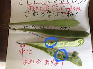 写真下は、さやを開いたところです。豆があります。(青丸)