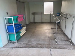 写真中はシャワー、写真下はビート板の棚とタオルかけです。