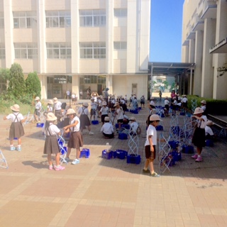 1年生の皆さんが中庭で、アサガオの植木鉢を片付けています。
