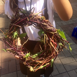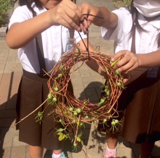 大きなリース、小さなリースと個性豊かです。頭の上にのせて、鳥の巣みたいと愉快な子どもたちもいます。