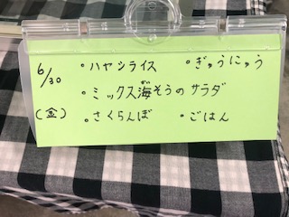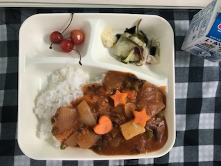 今日の給食は、ハヤシライスでした。ラッキーにんじんが入っています。