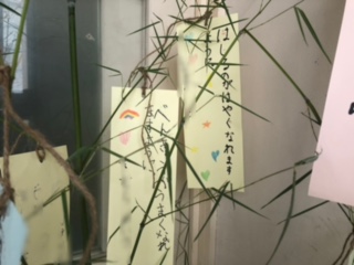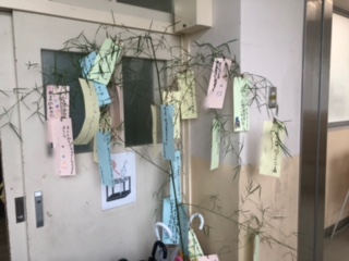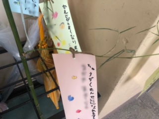 1年生の廊下には七夕の笹が飾られています。漢字がうまくなりたい、中学校の先生になりたいなどの願い事が飾られています。