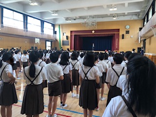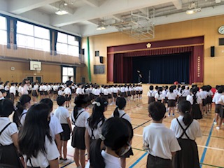 今日の児童朝会は暑さを考慮して運動場ではなく、講堂で行いました。