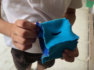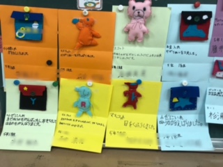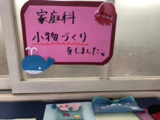 初めて習う家庭科で小物作りをしました。力作が展示されています。