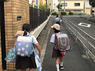 5時間目が終わった1年生と2年生を安全のため雷雨が収まるまで教室で預かり、雷雲が遠ざかってから下校するようにしました。写真は雨が上がった中、下校していく様子です。
