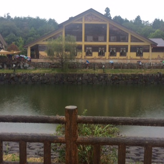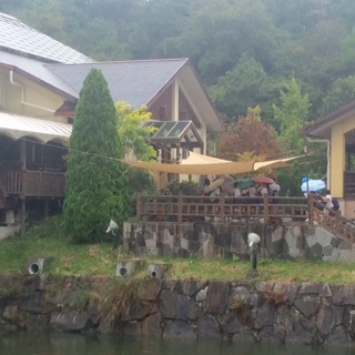 雨が降っています。ソーセージ作りを終えて、昼食を移動します。
