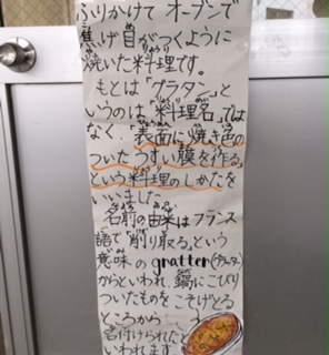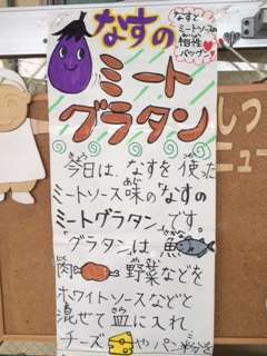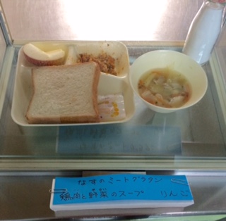 今日の献立、茄子のミートグラタン、鶏肉と野菜のスープ、リンゴ、牛乳です。