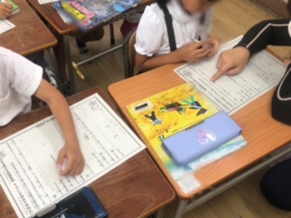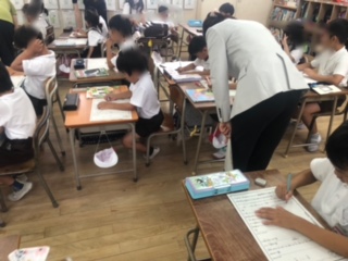 講師の先生が机をまわって子どもたちの書いた内容をていねいに見ておられます。