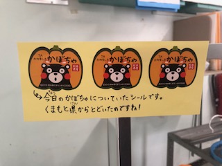熊本産のかぼちゃにはくまモンのシールが貼ってありました。見本献立のケースに展示されていました。