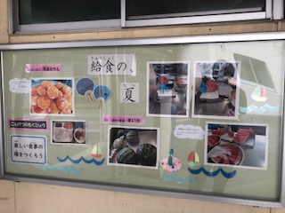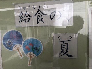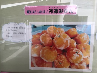 給食室の掲示板には給食の夏の果物の説明が貼られてありました。
