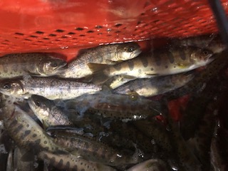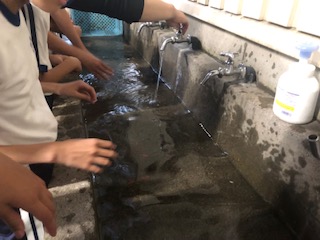 アマゴを手でつかみます。なかなかむずかしいようです。わぁ、きゃーという声が飛び交っています。