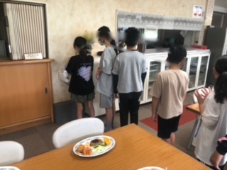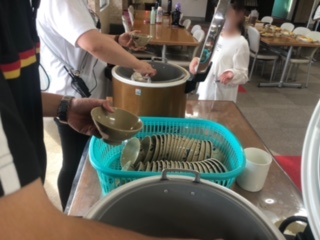 食事係が食堂に集まって手を洗った後、マスクをして配膳していきました。