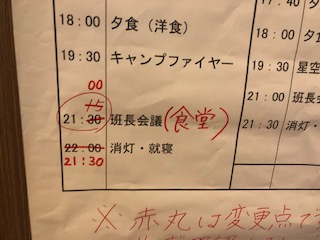 子どもたちの集合や行動がテキパキとしていて、予定より早く進んでいきます。明日の体力を考え30分時間を繰り上げて21時30分に消灯しました。(写真は男子の部屋の階)