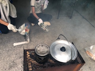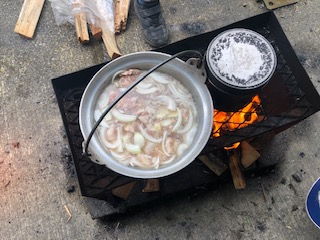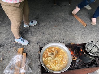 ようやく火もついてカレーもご飯もできてきています。