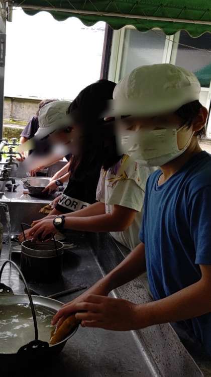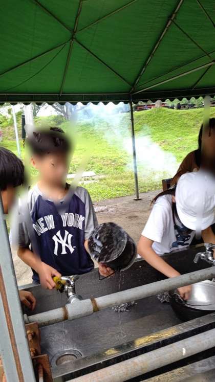 鍋や飯ごうの汚れはなかなか落ちません。がんばって洗っています。