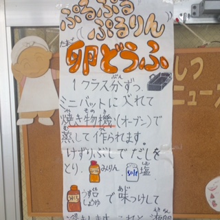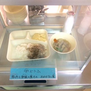 今日の献立、卵豆腐、豚肉と野菜の煮物、おかか菜っ葉、ごはん、牛乳です。