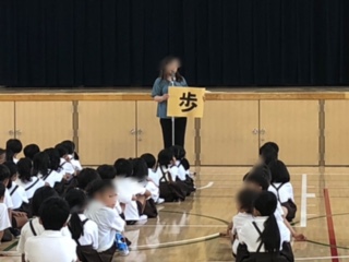 生活指導担当が漢字を示して、廊下などを歩くことが事故を防ぐために大切であることを話しました。