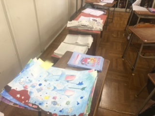 黒板に担任から子どもたちへの「おかえり(教室へ)」のメッセージと絵が書かれていました。夏休みの宿題も集められています。始業式の感じが出ていますね。