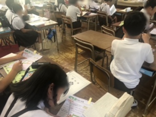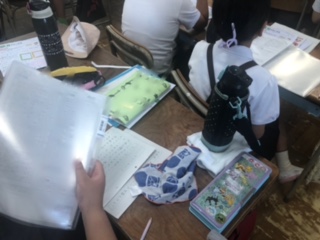 机の上には、夏休みの宿題や通知表などが置かれていて、提出を待っています。