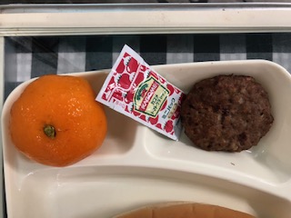 今日の給食には、ハンバーグとケチャップがでました。冷凍のみかんもつきました。