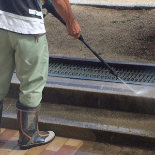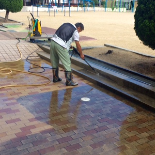 2学期当初より、管理作業員の井上さんがインターロッキング(浸水性ブロック)を高圧洗浄機で洗浄をしてくれています。